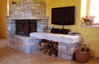 Das Haus beherbergt im Eg die Küche einen großen Wohnraum mit zwei Couches mit Kamin, einen gemeinsamenEssplatz und den Ausgang zur großen Terrasse.